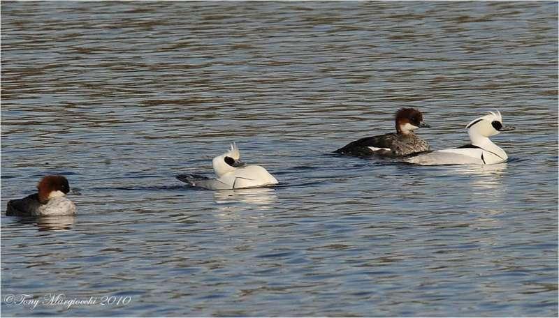 Это представитель самых мелких наших уток. По размерам луток не дотягивает и 50 см. А масса его тела и вовсе не больше полкило. Необычайно эффектен самец этой утки в брачном оперении. Практически белоснежный, с черной спинкой и пестрой манишкой на грудке, увенчанный небольшим хохолком на голове — какая тут устоит!