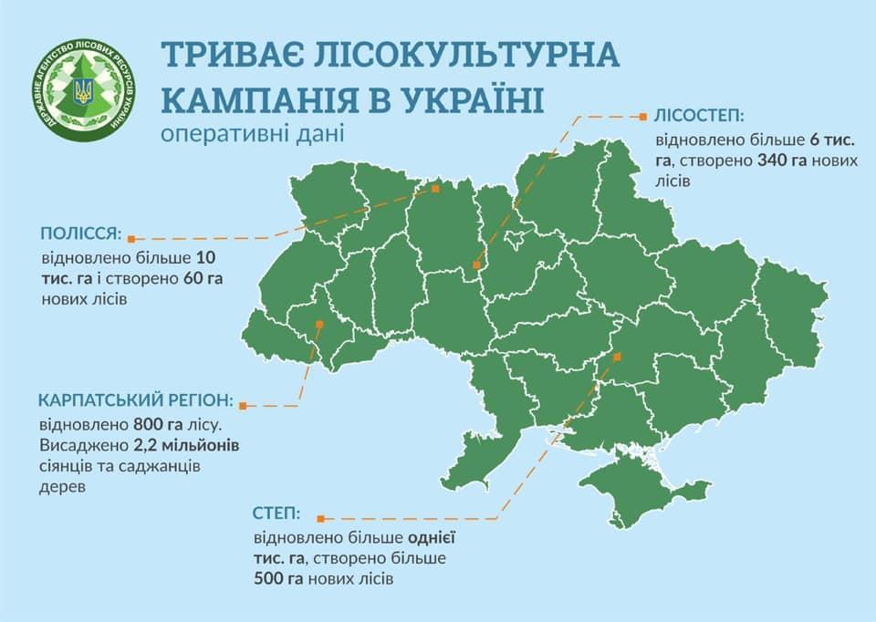 Так, більшість областей України вже майже завершили весняну лісокультурну кампанію. Проміжні дані такі:– на Поліссі відновлено більше 10 тисяч гектарів і створено 60 га нових лісів– у Лісостеповій зоні відновлено більше 6 тис. га, створено 340 га нових лісів– у Степовій зоні відновлено більше однієї тисячі га, створено більше 500 га нових лісів