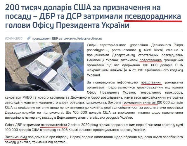 Сьогодні пресслужба ДБР повідомила, що у Києві нібито затримано превдорадника голови Офісу Президента, який вимагав 200 тисяч доларів за призначення потерпілого на керівну посаду в Державному агентстві лісових ресурсів України та вирішення питання щодо непритягнення до кримінальної відповідальності за результатами перевірки на його підприємстві.