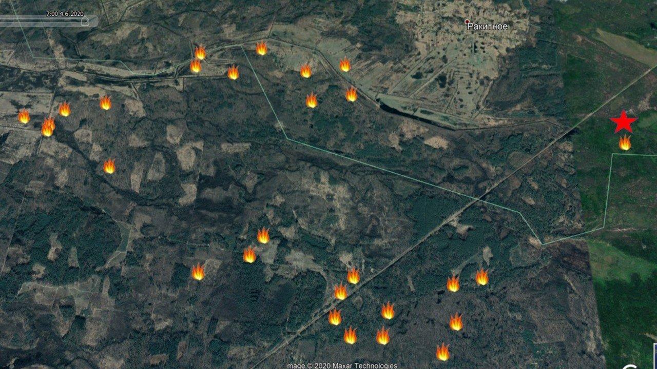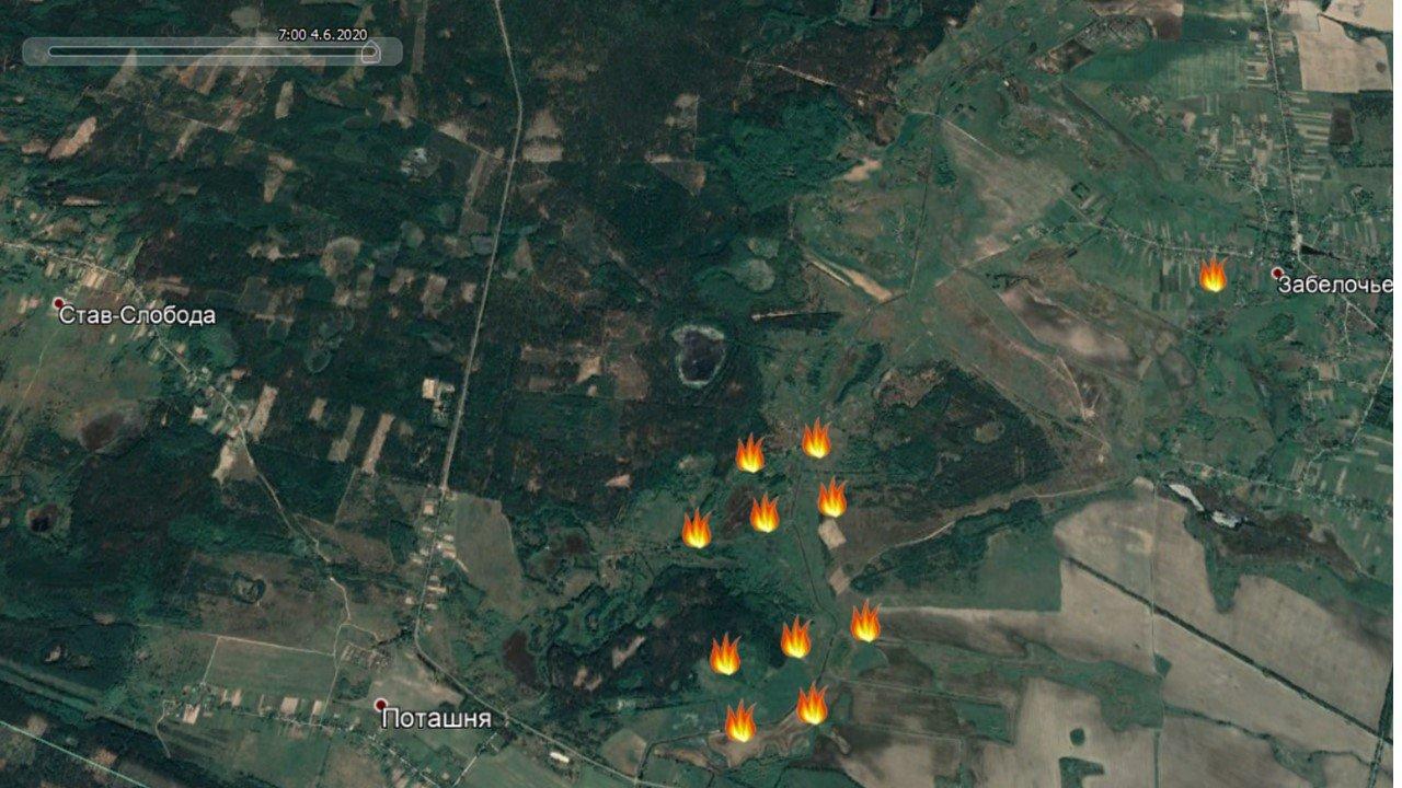 Ниже Белокоровичи. Поясковское лесничество. Судя по динамике термоточек, – потушено ещё вчера.