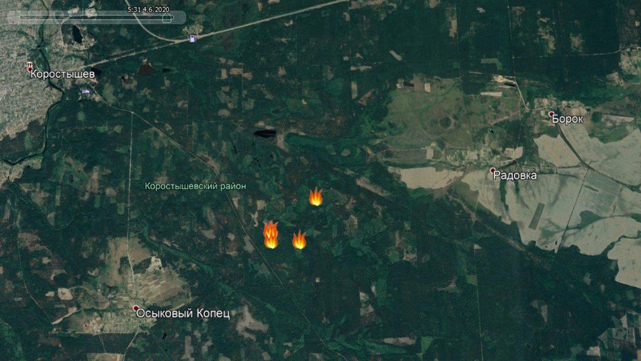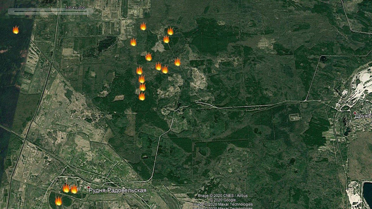 Карастышевский лесхоз, Крапивнянское лесничество. ориентировочно квартала 13-14 или соседние . Лесной пожар возник недалеко от дороги на Крапивню сегодня глубокой ночью. На снимке появился в два ночи. В четыре ночи появилось ещё два очага в направлении Раданки. Оба по просекам. Предположительно поджог.