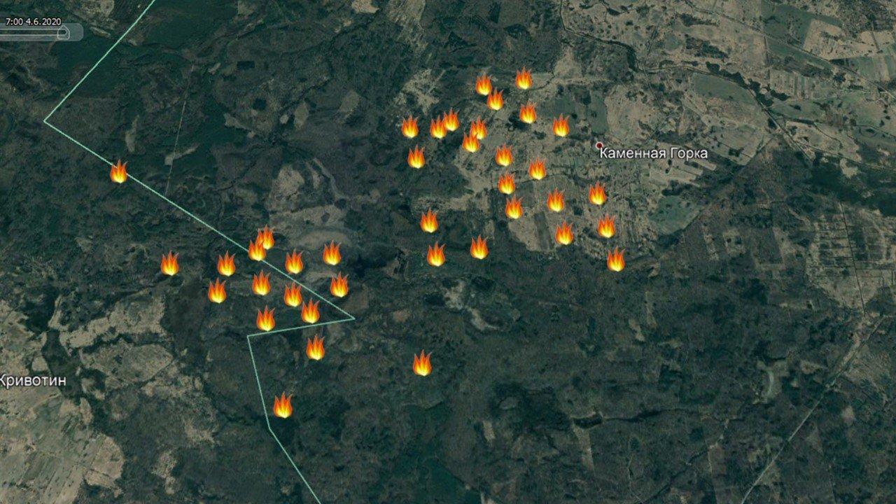 Ниже ещё одно возгорание в Лугинском ЛГ. На этот раз в его северной части. Кажется это Радогощанское лесничество. Пожар начался на полях вокруг Каменной горки, а затем появился и на территории леса. Пожар спонойный: свежих возгораний не видно.