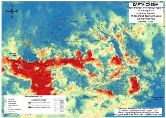 На основі наукових досліджень Центру упродовж 2016-2018 рр. було розроблено карту з поділом території зони відчуження на зони з різними ризиком розвитку пожеж (burn probability), яку пожежні служби можуть використовувати для попередження пожеж та швидкого реагування на пожежі (карта розміщена на сайті Центру моніторингу пожеж) (рис. 1) [4].