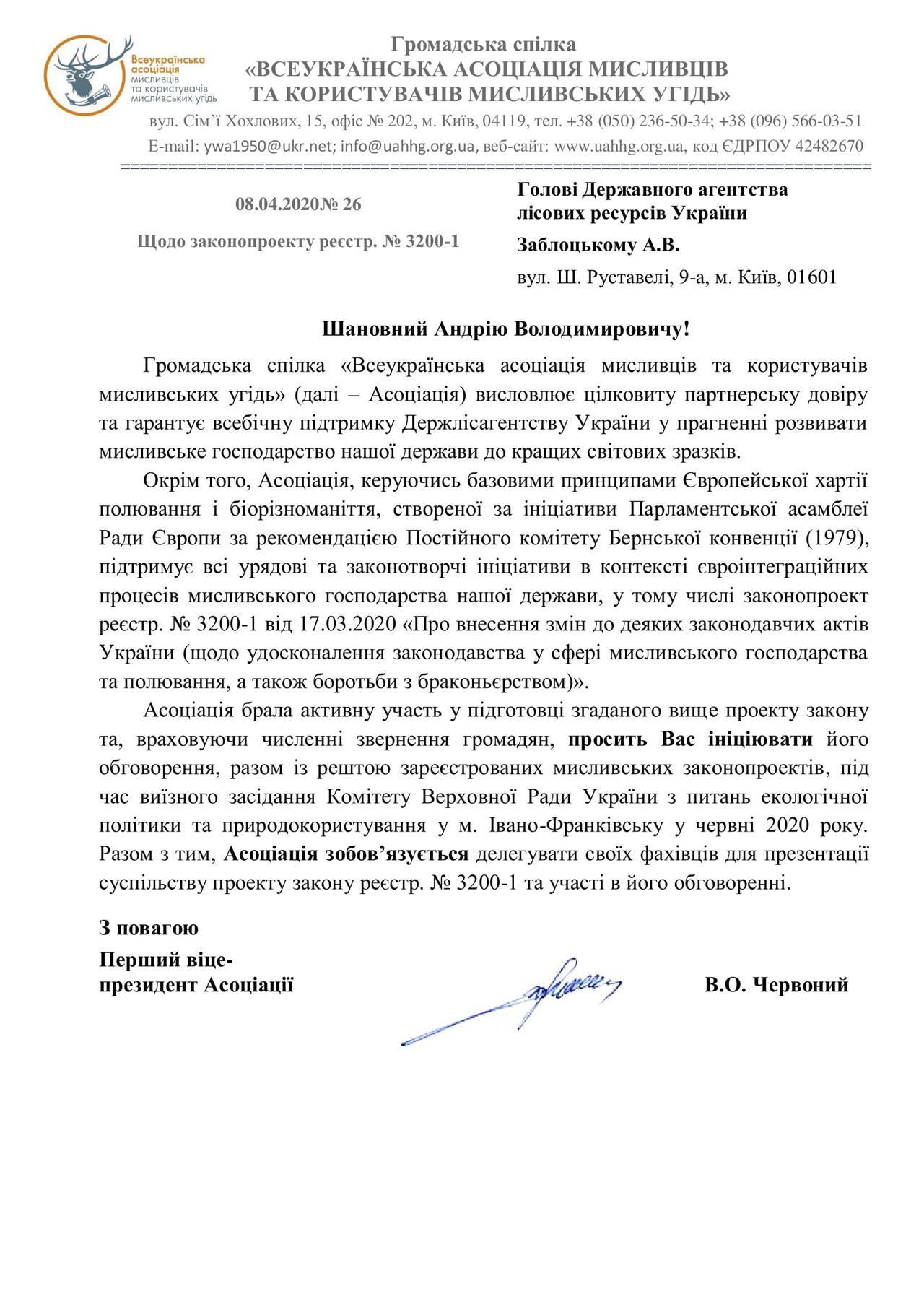 Асоціація брала активну участь у підготовці згаданого вище проекту закону і, враховуючи численні звернення громадян, просить Вас організувати його розширене обговорення разом із рештою зареєстрованих галузевих законопроектів під час виїзного засідання Комітету Верховної Ради України з питань екологічної політики та природокористування у м. Івано-Франківськуу червні 2020 року, а також запросити наших представників – першого віце-президента Червоного Віктора Олександровича, голову науково-технічної ради Асоціації доктора наук (спеціальність – екологія) Новицького Василя Петровича та члена Ради Асоціації кандидата наук (спеціальність – лісівництво) Делегана Івана Івановича презентувати суспільству проект закону реєстр. № 3200-1 та прийняти участь в його обговоренні.