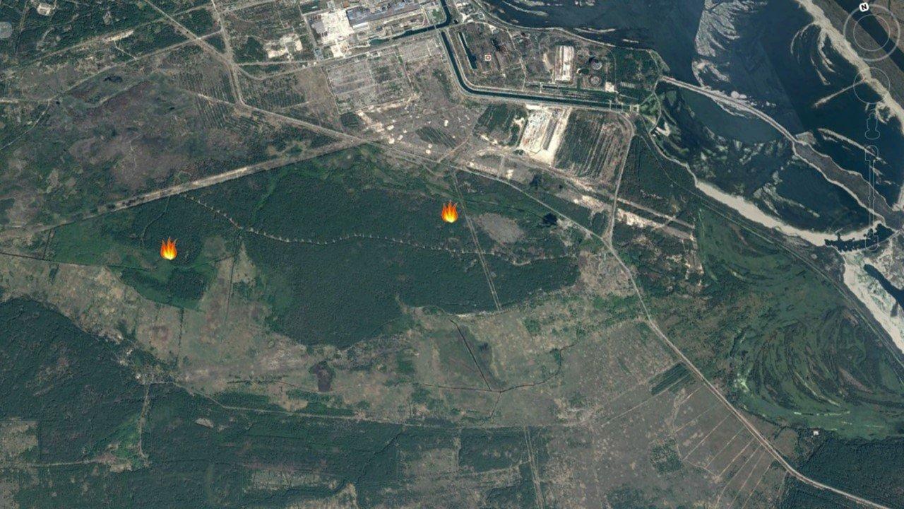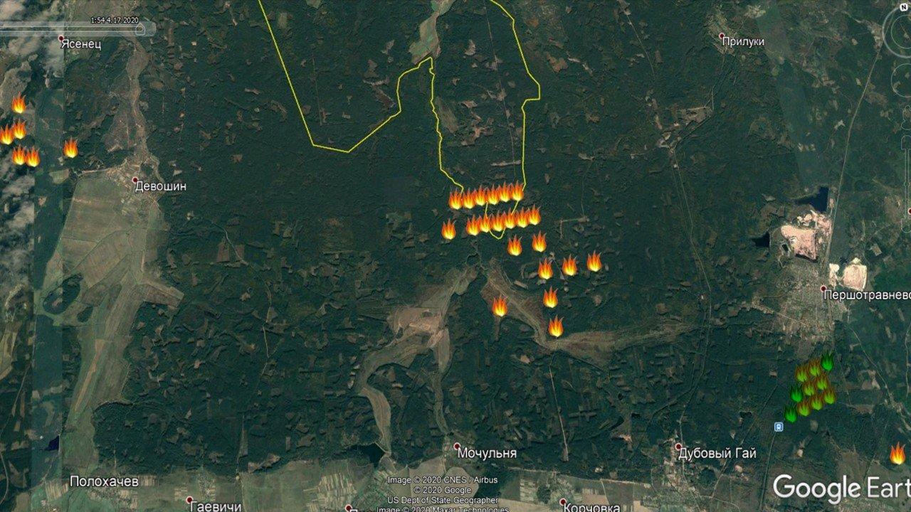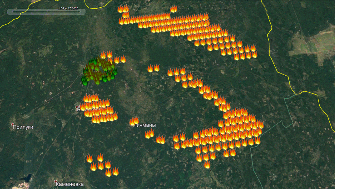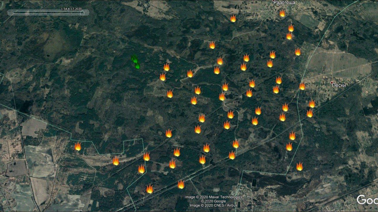 Вот как выглядела в прошедший полночь ситуация в Овручском спецлесхозе , где также “грязно” (по цезию) , как и в Народичах. Термоточки на середину дня выделил зеленым цветом. Те что появились позднее оставил желтыми.