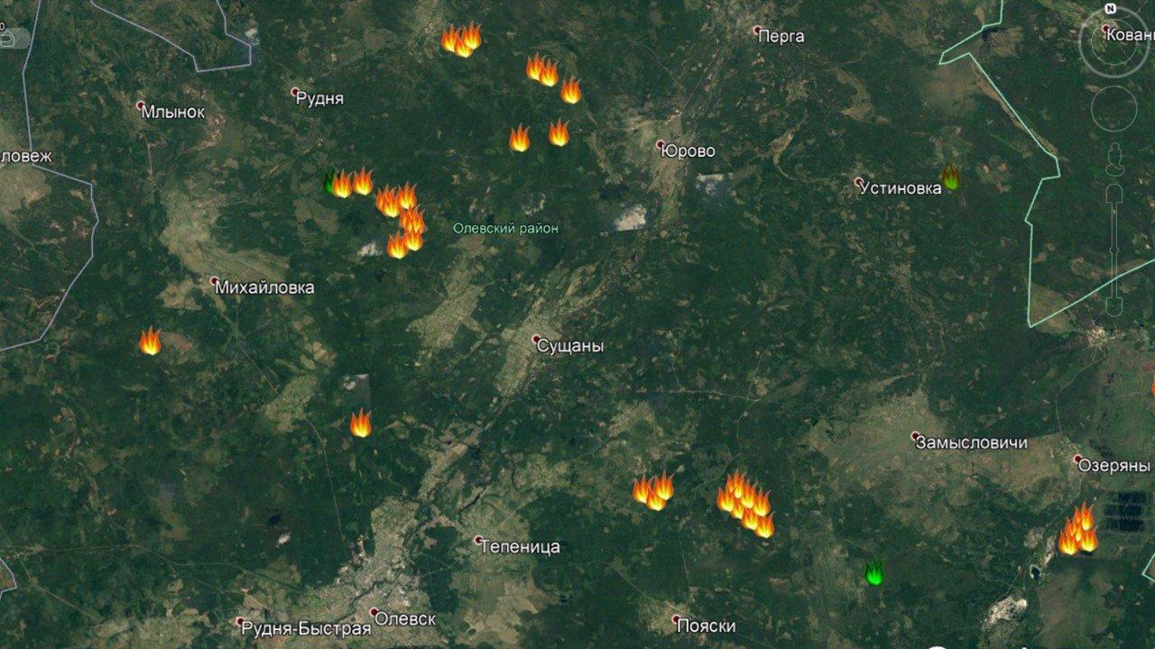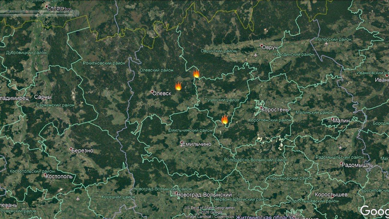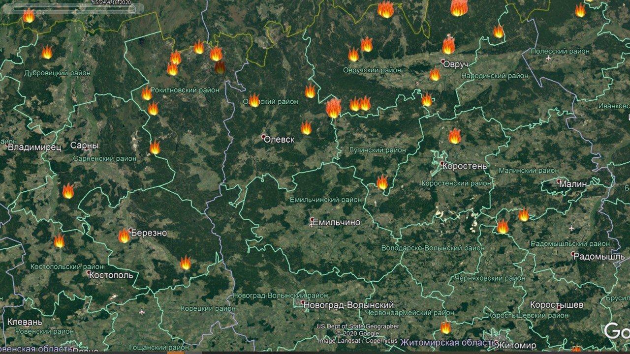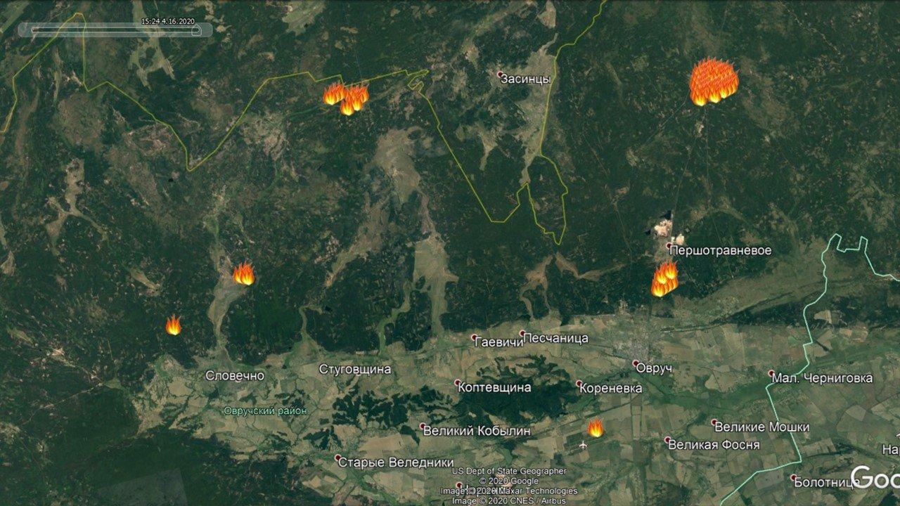 Особенно неприятна ситуация в Овручском районе (на заглавном скриншоте). Здесь 6 пожаров, прием три весьма опасных и быстро прогрессирующих.