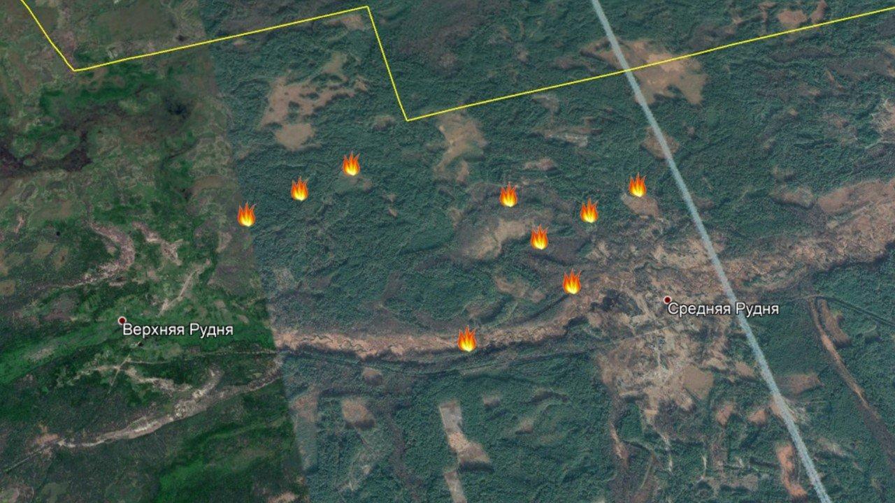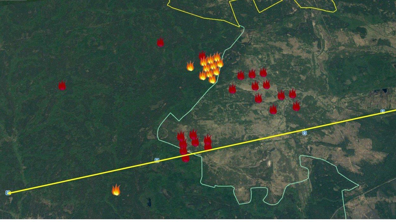 Ниже привожу ситуацию по состоянию на 00:00 часов 17.04.2020, то есть за полные сутки 16 апреля. На всех скриншотах желтые метки показывают возгорания на 14 часов дня, а красно-фиолетовые на конец суток. Я уже объяснял, что съемка ведется с интервалом около 6 часов, поэтому оценки времени условны. Сначала я пройдусь по местам возгораний, которые приводил вчера (выше в этом же материале).