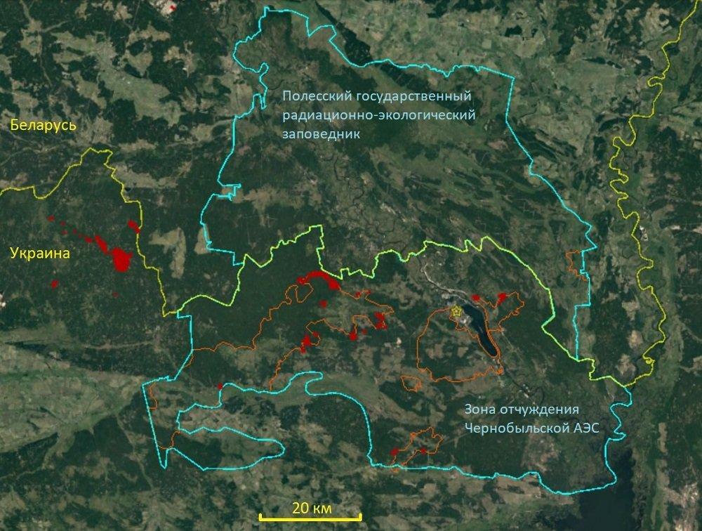 По состоянию на утро 20 апреля 2020 года, площадь, пройденная ландшафтными (преимущественно лесными) пожарами в границах Зоны отчуждения Чернобыльской АЭС в Украине, составила около 57 тысяч гектаров, что соответствует примерно 22% от ее общей площади. Как минимум три крупнейших пожара продолжают действовать, в том числе один – в непосредственной близости от АЭС (горят участки на противоположном берегу реки Припять, примерно в четырех километрах от саркофага).