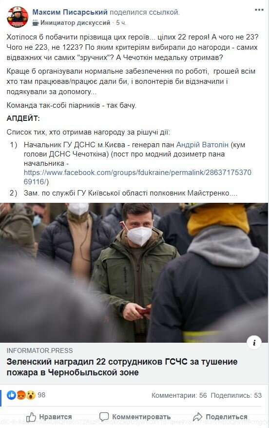 “Хотілося б побачити прізвища цих героїв… цілих 22 героя! А чого не 23? Чого не 223, а не 1223? За якими критеріями обирали до нагороди – найвідважніших або ж “зручних”? А Чечоткін отримав медальку? Краще б організували нормальне забезпечення по роботі, грошей всім хто там працював/працює дали б і волонтерів відзначили і подякували за допомогу… Команда так-собі піарників – так бачу. Апдейт: Список тих, хто отримав нагороду за рішучі дії Начальник ГУ ДСНС р. Києва – генерал пан Андрій Ватолін (кум голови ДСНС Чечоткіна), заст. по службі ГУ Київської області полковник Майстренко “, – пишуть у групі “Бойкот пожежних України”.