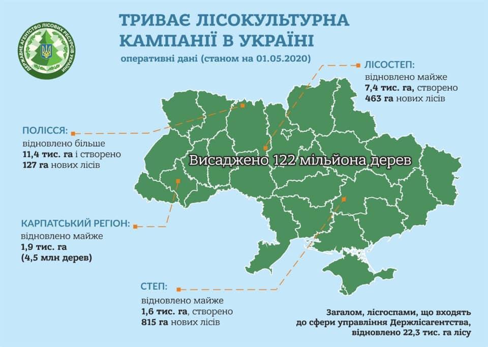 «Якщо говорити цифрами, то на цей час загалом відновлено 22,3 тис. га лісу, зокрема, на Поліссі відновлено більше 11,4 тис. га (майже 71 млн дерев) і створено 127 га нових лісів; у Лісостеповій зоні відновлено майже 7,4 тис. га (38,3 млн дерев), створено 463 га нових лісів; у Степовій зоні відновлено майже 1,6 тис. га (майже 8 млн дерев), створено 815 га нових лісів; в українських Карпатах відновлено майже 1,9 тис. га (4,5 млн дерев)», – поінформував Андрій Заблоцький.