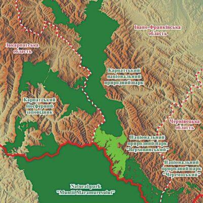 Також у Карпатському регіоні найбільша в Україні кількість існуючих та створюваних транскордонних екологічних коридорів і резерватів. Сьогодні їх три. Це створений у 1998 р. біосферний резерват «Східні Карпати», в якому об’єднались Польща, Словаччина, Україна, (українська частина – Ужанський нацпарк), та створювані екологічні коридори – Турківський (Польща – Україна, представлена, зокрема, нацпарком «Сколівські Бескиди», регіональним ландшафтним парком «Надсянський») і Буковинський (Румунія – Україна, представлена нацпарком «Вижницький»). А іще на верхніх схилах гір Верховинськго району Івано-Франківської області, там, де національний природний парк «Верховинський» межує з національним парком у Румунії «Мармароські гори», маємо унікальні умови для створення в Українських Карпатах іще одного масштабного транскордонного екологічного коридору. Для цього не вистачає одного невеликого «пазла» (див. карту). Ціна питання – ділянка лісу верхнього схилу гір площею 11,7 тис. га, що перебувають у користуванні ДП «Верховинський лісгосп».