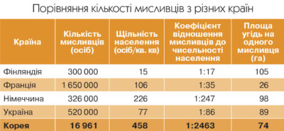 У 1982 р. у Кореї налічувалось 2233 мисливці, але їх кількість постійно збільшувалась: у 1986 р. – 4829 мисливців, у 1990 р. – 6581. А після того, як для полювання було відкрито дві провінції, чисельність мисливців різко зросла: у 1992 р. – до 8588 мисливців, у 1995 році – до 13 458 осіб.