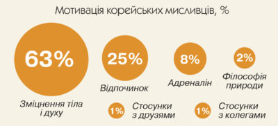 Для мисливців Кореї основною мотивацію є зміцнення тіла та духу (62,6%), відпочинок (8,4%), інше (3,8%). 88,3% корейських мисливців йдуть за компанію на полювання з друзями та колегами.