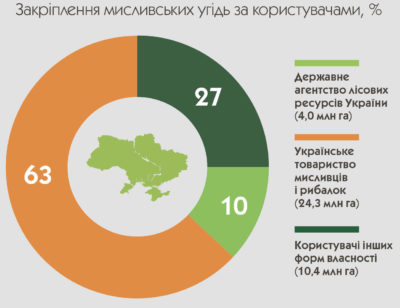 Площа наданих у користування мисливських угідь в Україні за рік майже не змінилась. Українське товариство мисливців і рибалок (УТМР) залишається найбільшим користувачем, якому надано 24,3 млн га (63%) мисливських угідь, підприємства Держлісагентства мають 4 млн га (10%) та користувачі іншої форми власності, яких в Україні, до речі, вже налічується 624, мають у користуванні 10,4 млн га або 27% від усіх угідь.