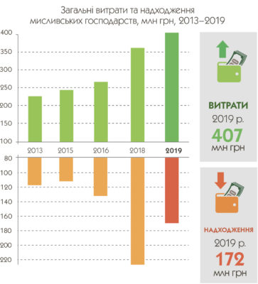 При тому, що держава на свій біоресурс не витрачається жодним чином, мисливська галузь на ведення господарства у 2019 році виклала 407 млн грн. Надходження ж від нього становило лише 172 млн грн або 42% від витрат. Про яку рентабельність тут можна говорити? Але треба враховувати один нюанс – є мисливські товариства, які вносять вартість відстрільних карток у членські внески, тим самим приховуючи реальні надходження від мисливського господарства, тому ця цифра може бути значно більшою.