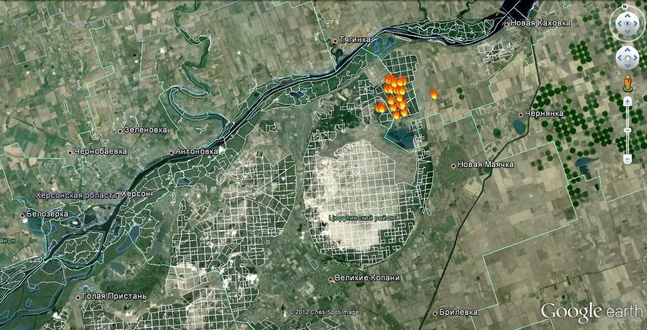 Горит Корсунское лесничество Каховского лесхоза. Странно, но пожар в В.-Копанях FIRMS пока не отражает.