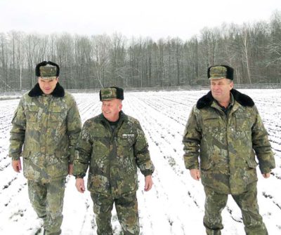 Як почувають себе зимової пори сіянці сосни звичайної, цікавляться лісничий Леонівського лісництва Іван Осипенко (в центрі), помічник лісничого Валерій Савченко (праворуч) і лісник Олег Сударєв