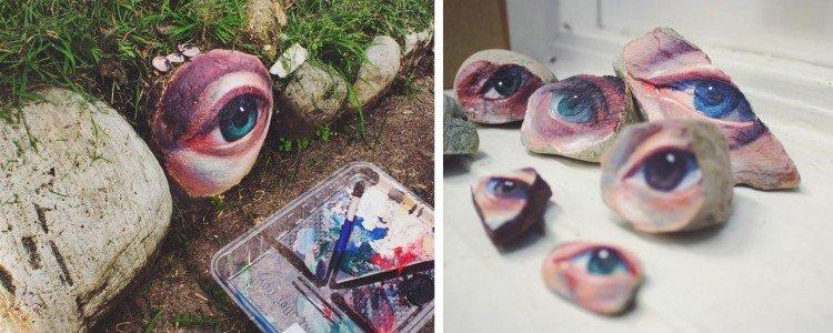 Если вам случится прогуливаться где-нибудь в Австралии и вы неожиданно увидите в кустах камень с нарисованным на ним человеческим глазом, знайте — это не следы загадочного ритуала. Это современное искусство, над которым потрудилась художница Дженнифер Оллнат (Jennifer Allnutt).