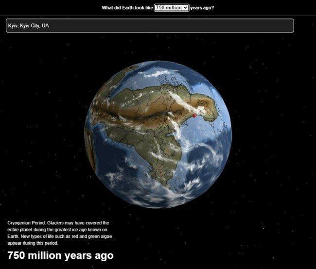 Задать можно период в диапазоне от 750 млн лет назад до наших дней. Правда, шаг будет достаточно большим. Кроме того, здесь можно выбрать определенное событие, имевшее большое значение для развития жизни на планете: от появления первых водорослей до динозавров. К примеру, место, где сейчас находится Киев, менялось с засушливых регионов и полярных шапок, до тропических лесов за последние миллиард лет.