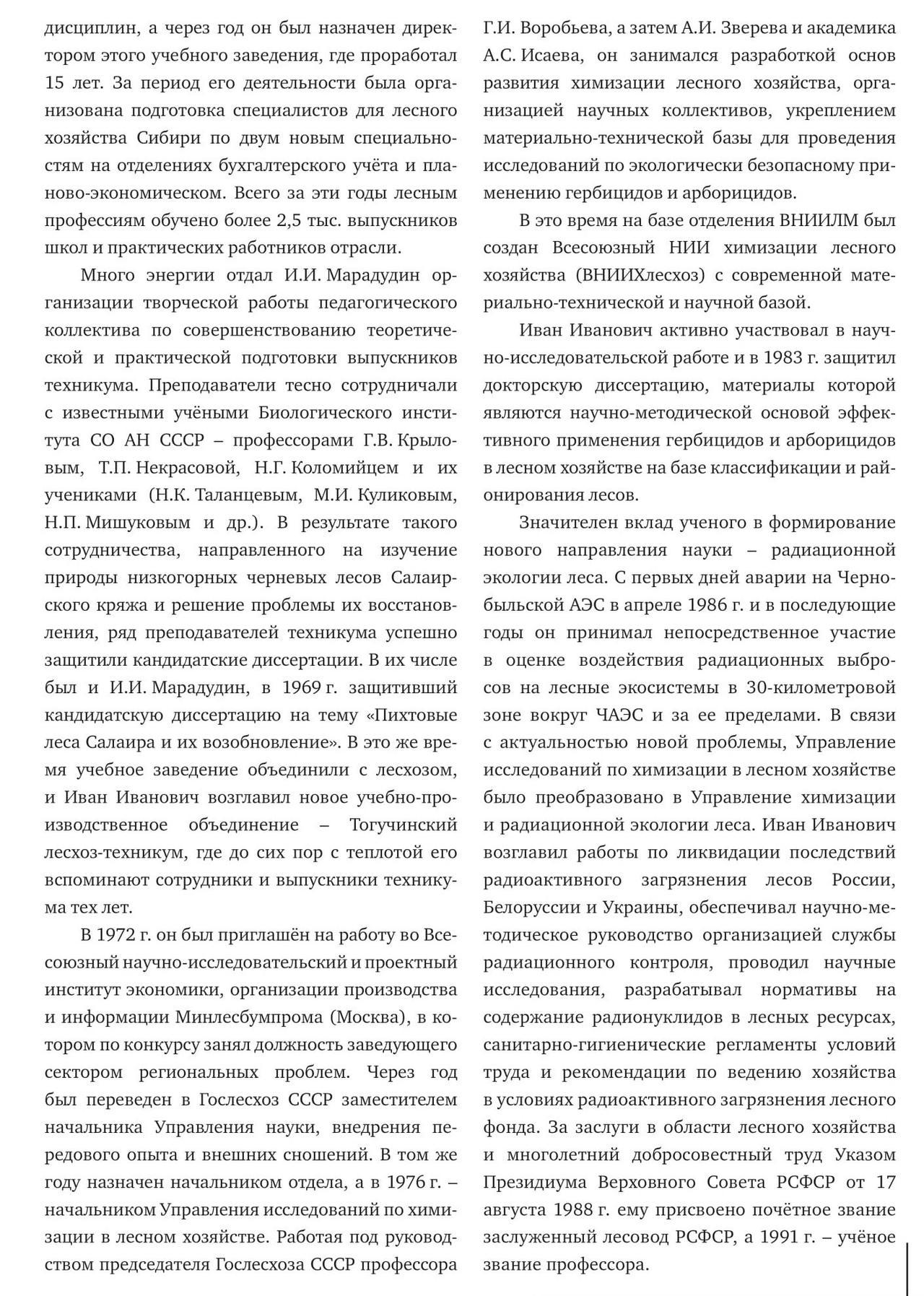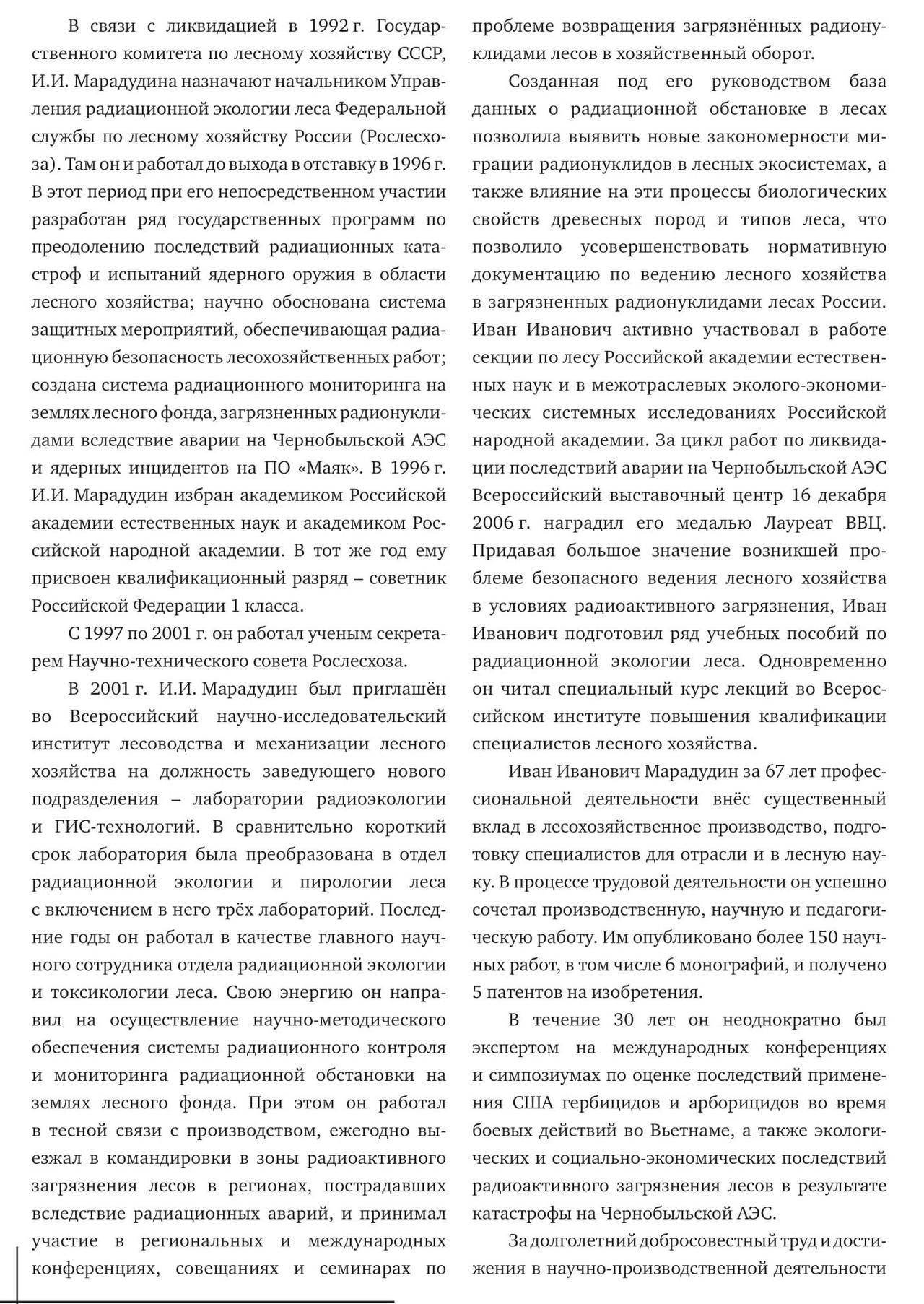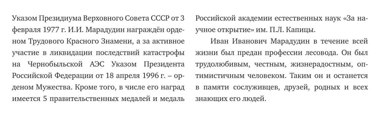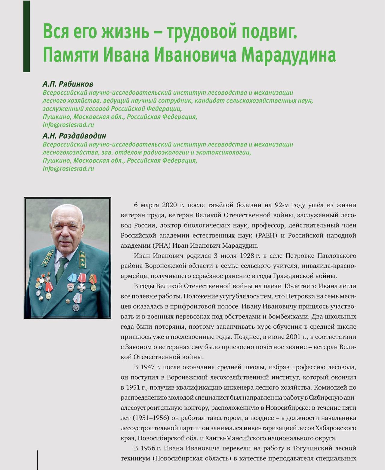 В третьем номере периодического издания ВНИИЛМ опубликована статья посвященная памяти Ивана Ивановича Марадудина, ушедшего из жизни в марте этого года. Все кто имел отношения к ликвидации последствий аварии на ЧАЭС в самые тяжелые первые годы, помнят этого спокойного, основательного и доброжелательного человека, прожившего долгую и красивую лесную жизнь. В те годы Иван Иванович часто бывал в Украине: сам на ходу учился и помогал становлению лесной радиоэкологии в нашей стране. Для Валерия Ивановича Самоплавского, Николая Николаевича Калетника, своих друзей по жизни и Чернобылю – Николая Кучмы, Николая Савущика, Владимира Ландина размещаю эту статью. К сожалению уже нет Анатолия Павловича Мороза, Валерия Михайловича Брежнева, Николая Павловича Архипова и многих других, кто знал Иван Ивановича по встречам в Чернобыле…и не только… Статья это повод вспомнить добрым словом хорошего ЧЕЛОВЕКА, а также те годы, за которые не стыдно…