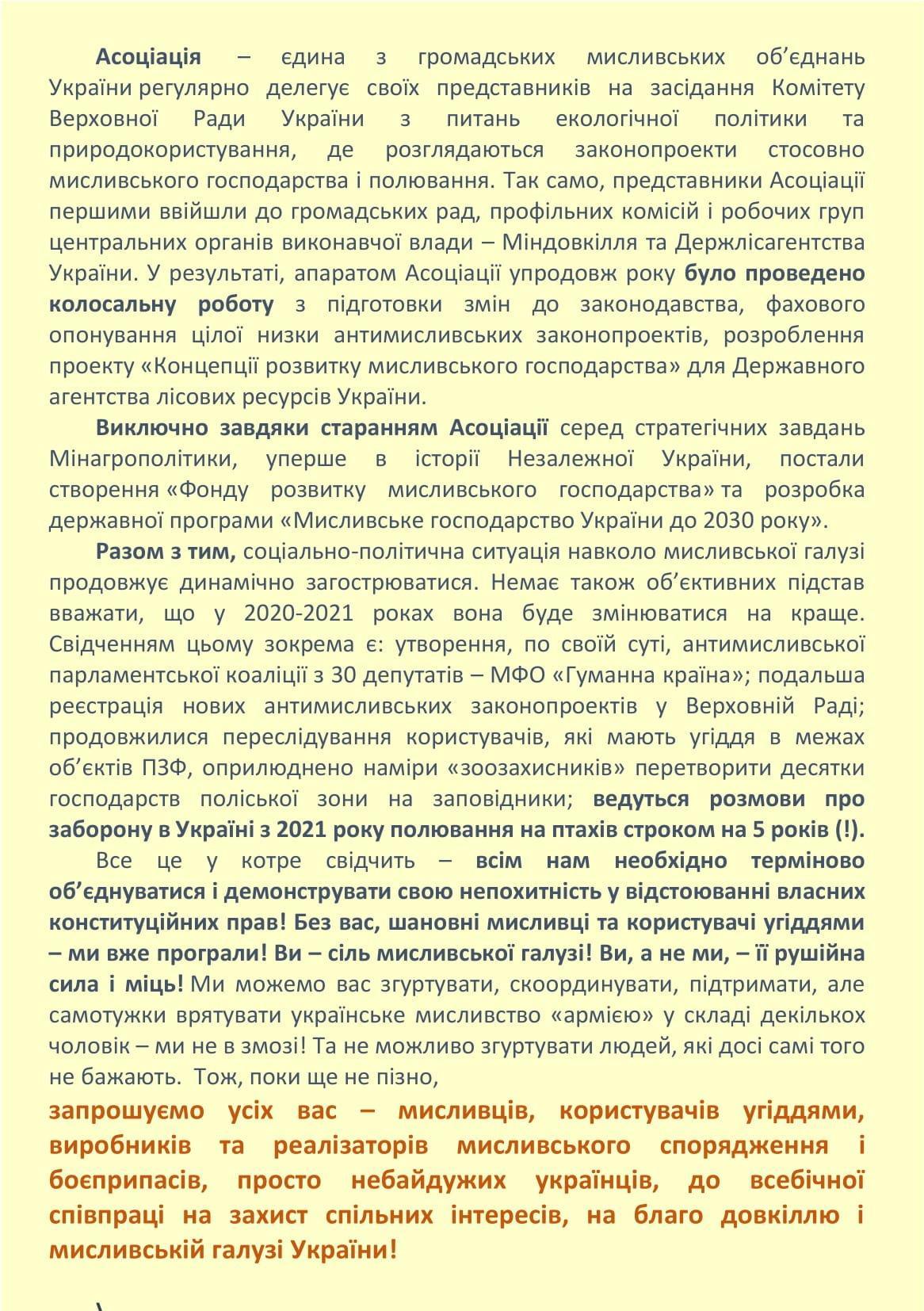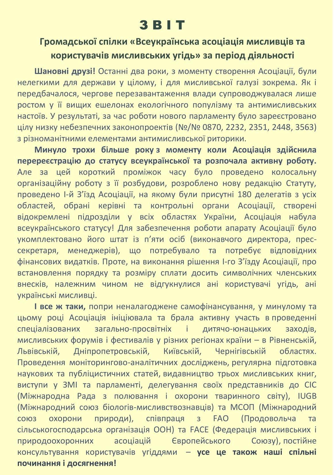 ЗВІТ Громадської спілки «Всеукраїнська асоціація мисливців та користувачів мисливських угідь» за період діяльності