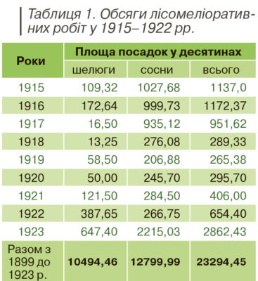 Посадки шелюги мали задовільну приживлюваність, а значна частина сіянців сосни, висаджуваних селянами без належного догляду, гинула. Одначе набутий досвід і усвідомлення селянами важливості лісомеліоративних робіт давали можливість рік у рік збільшувати обсяги лісопосадок і підвищувати їх приживлюваність. Лісопосадки на пісках і ярах у Харківсько-Полтавській окрузі стали добровільною всенародною толокою. Лише в Полтавській губернії до 1914 р. було закріплено, за даними лісомеліоратора В. М. Борткевича (1923), 225 ярів, посаджено на пісках 9565,1 десятини шелюги і 8557,55 десятини лісокультур сосни. За даними В. Я. Гурського, з 1899 р. до 1917 р. в українських губерніях було посаджено на пісках шелюги 68 706 десятин і лісокультур сосни 60 555 десятин. 1913 р. уряд асигнував на лісомеліоративні роботи 2 млн крб і земства – 251 389 крб (ЦДАВОВУ, ф. 33, оп. 4, спр. 6, арк. 39).