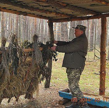 – У другому півріччі цього року відбулися значні поліпшення в організації і реалізації нашої роботи. Так, за сприяння керівництва Житомирського обласного управління лісового та мисливського господарства й керівництва нашого лісгоспу, було оновлено існуючі та збудовано нові комплекси для підгодівлі мисливських тварин і птахів майданчики під накриттям, де є і ясла для сіна, снопів, віників; годівниці й коритця для зерна і зерновідходів; халабуди-зайчатники з «ласощами» для русаків. Штучні солонці, у яких мають велику потребу більшість травоїдних, тому для лосів і козуль їх влаштовано у зрубаному на висоті один-півтора метра від землі стовбурі осики або тополі, на вершині якого у розщеплення встановлено лизунця або брикет солі, а для зайців шматок цього мінералу кладемо прямо в годівничку. Тут є і торф’яні купальні, аби допомогти диким тваринам у боротьбі з кліщами та іншими ектопаразитами, – зазначає мисливствознавець.