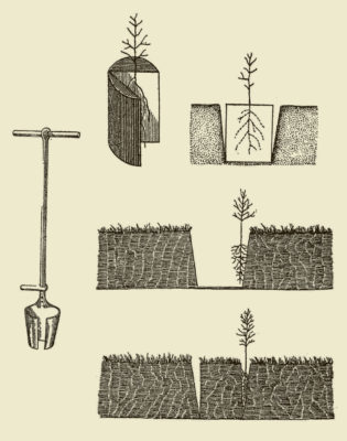 Очевидно, в той період була опрацьована і традиційна на сьогодні технологія садіння сіянців під меч. Передумови цієї технології (садіння сіянців з оголеною кореневою системою шляхом її затискування в грунті) формувалися при використанні названих вище лісосадильних знарядь, призначених для різних типів грунтів. Так, на піщаних грунтах застосовувались дерев’яні кілки, на щільних – важкі, наковані залізом (рис. 2). На задернілому грунті попередньо знімали дернину, застосовуючи спеціальний кілок з ножем, так званий кілок Ієроніма (рис. 2). На оголеній з його допомогою ділянці сіянець висаджували, використовуючи кілок звичайний. На дуже твердих грунтах ямку для садіння сіянця робили важкою сокирою (колуном) або спеціально виготовленим садильним молотком (рис. 2). Гострим кінцем молотка робили ямку, опускали в неї коріння сіянця, тупим кінцем загортали.