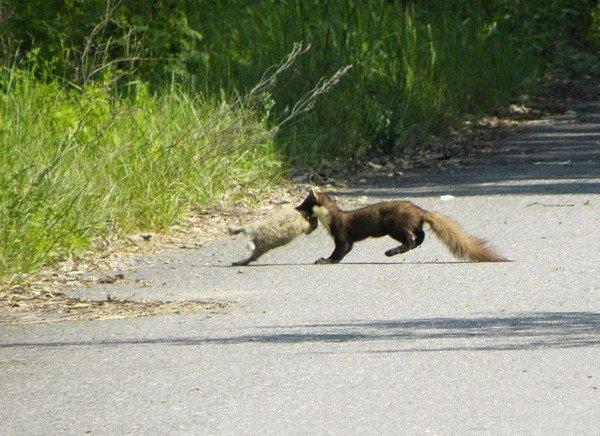 Опять раздалось верещание и, видимо, вырвавшись из когтей куницы, зайчишка снова выбежал на асфальтированную дорогу и помчался по ней. Тут его, в несколько прыжков, и настигла куница, схватила зубами за шею и начала резко мотать из стороны в сторону.