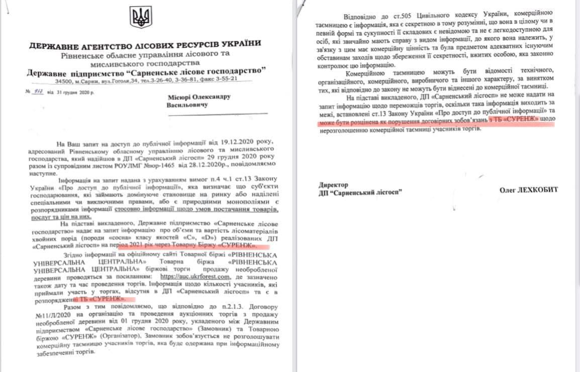 Іншим, не менше важливим питанням є те, як Рівненське обласне управління лісового та мисливського господарства скоординовало діяльність лісгоспів Рівненщини, що вони одномоментно і організовано продають великі об’єми лісових ресурсів через товарну біржу «Суренж» в підозрілих і нечесних умовах?