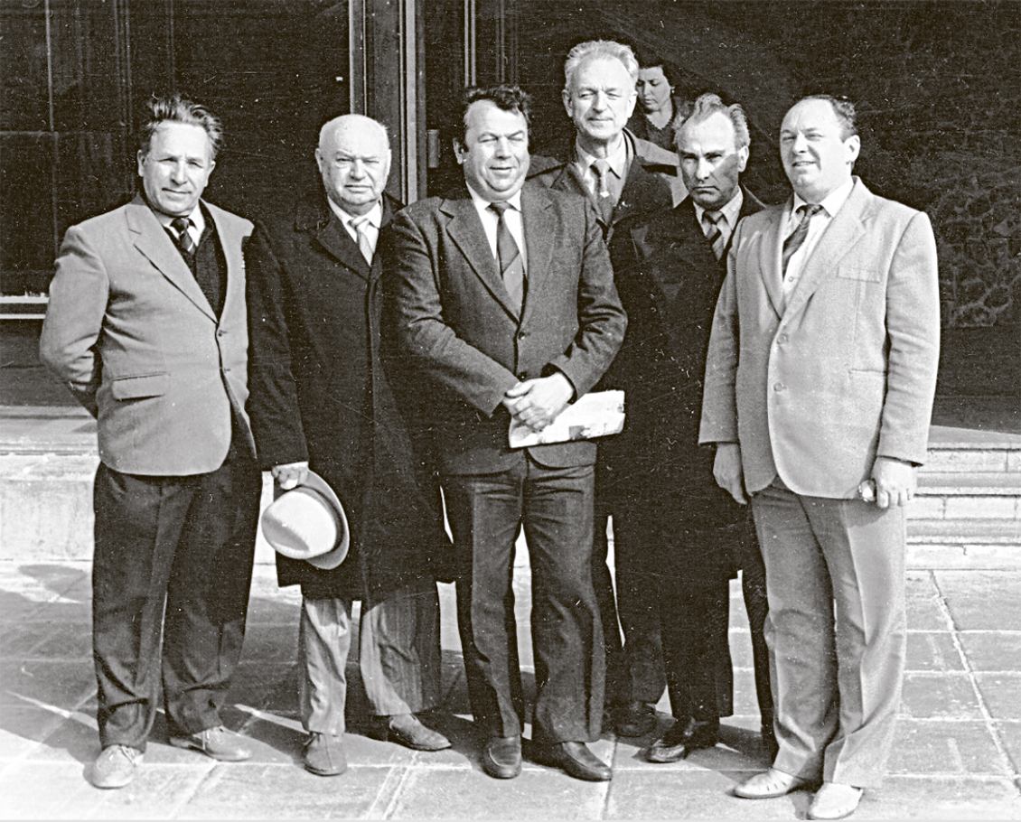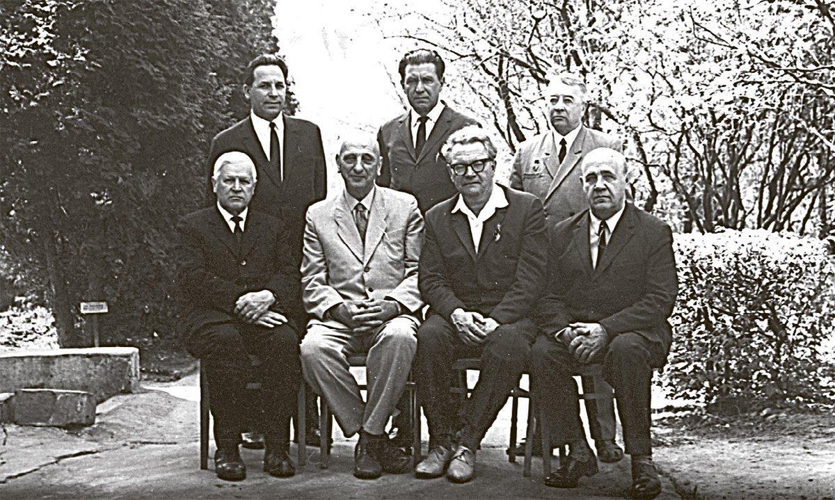 Декан В.М. Портной у колі своїх учителів: ліворуч – доц. П.І. Герасименко, проф. Т.Т. Малюгін; праворуч – доц. Г.О. Порицький, доц. В.С. Наконечний, проф. А.В. Цилюрик