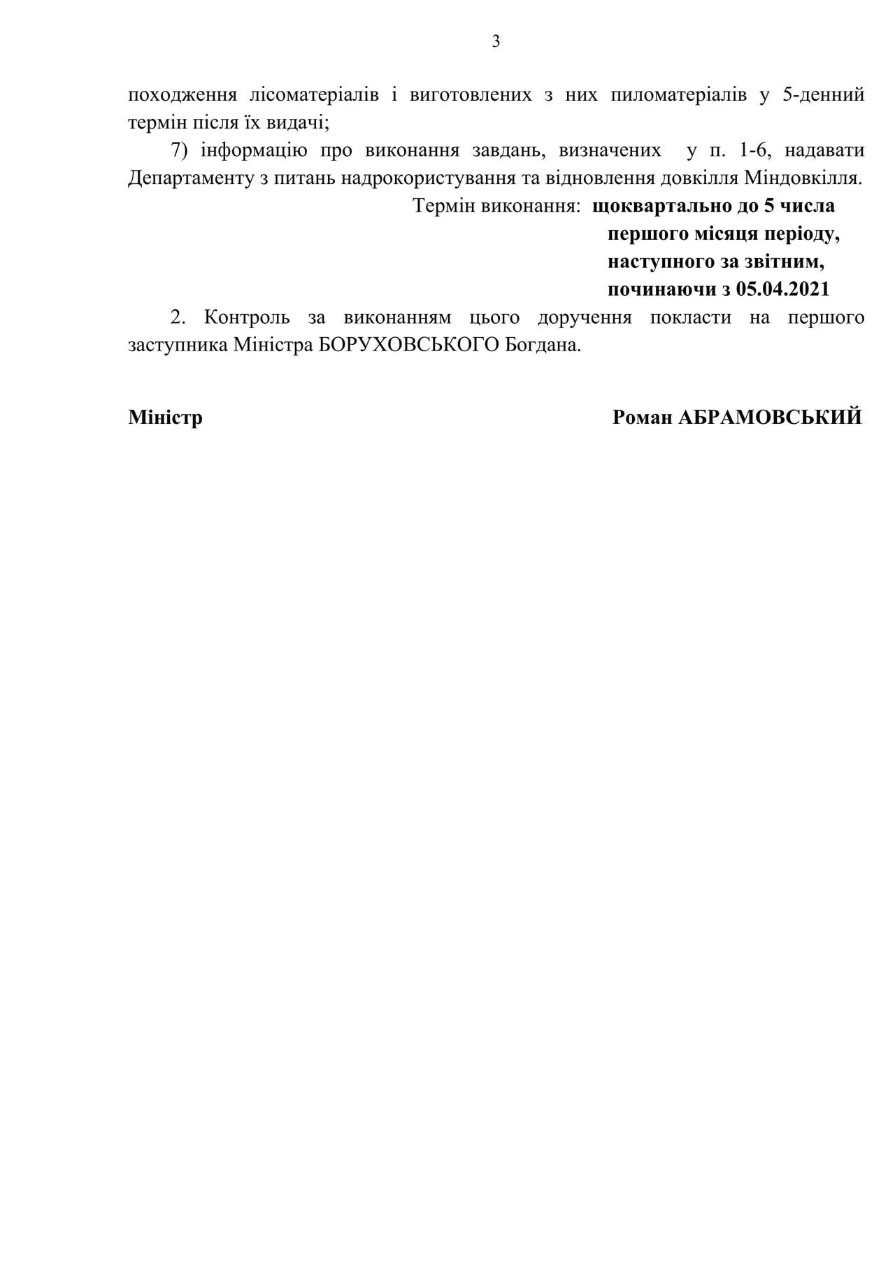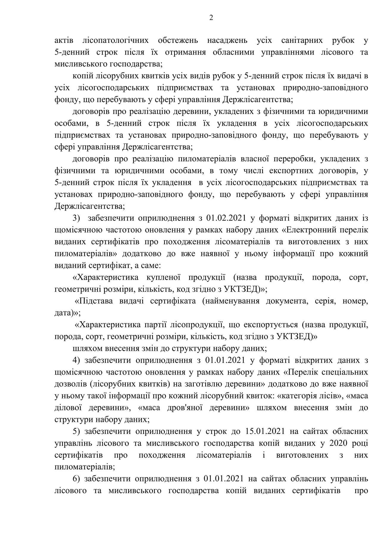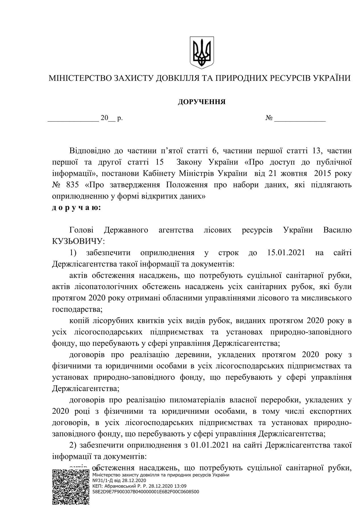 28 грудня 2020 року Міністерство захисту довкілля та природних ресурсів видало доручення №31\1-Д, яким Держлісагентству пропонується оприлюднювати по всім своїм підприємствам та територіальним органам наступну інформацію: