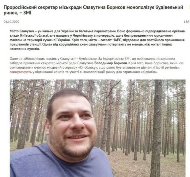 Володимира Борисова, секретаря міськради Славутича, «Стоп корупції» звинувачували в проросійській позиції і захопленні будівельного ринку міста.