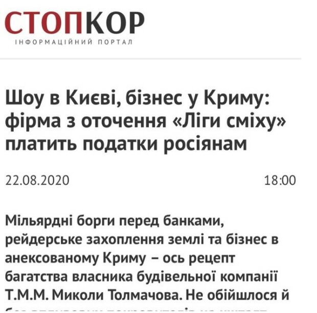 Ще один фігурант “розслідувань “Стопкору” – власник будівельної компанії “Т.М.М.” Микола Толмачов. Його звинуватили у бізнесі з Росією та виведенні грошей в офшори. На думку бізнесмена, замовником подібних матеріалів міг виступити “Альфабанк”.