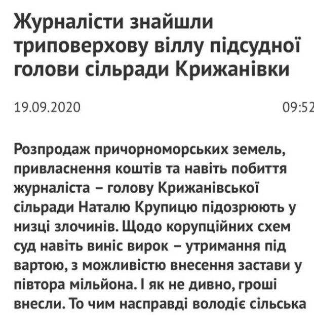 Наталя Крупица, сільський голова села Крижанівка (Одеська область), яка є постійним героєм публікацій “Стоп корупції”, пов’язує сюжети організації з місцевими виборами. За словами Крупиці, активісти ніколи не зв’язувалися і навіть не намагалися отримати її коментар.