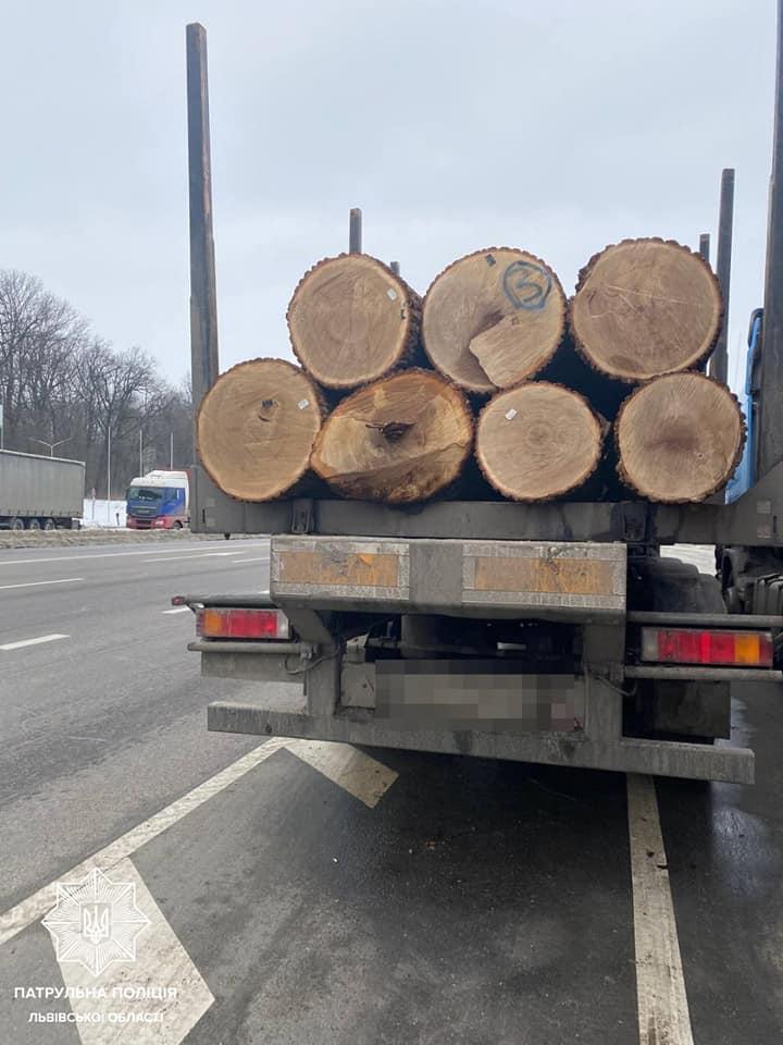 Як йдеться у повідомленні, біля населеного пункту Ямпіль, що на автодорозі Київ — Чоп, патрульні 3 батальйону виявили вантажівку Mercedes-Benz з напівпричепом із деревиною, а саме колоди дуба.