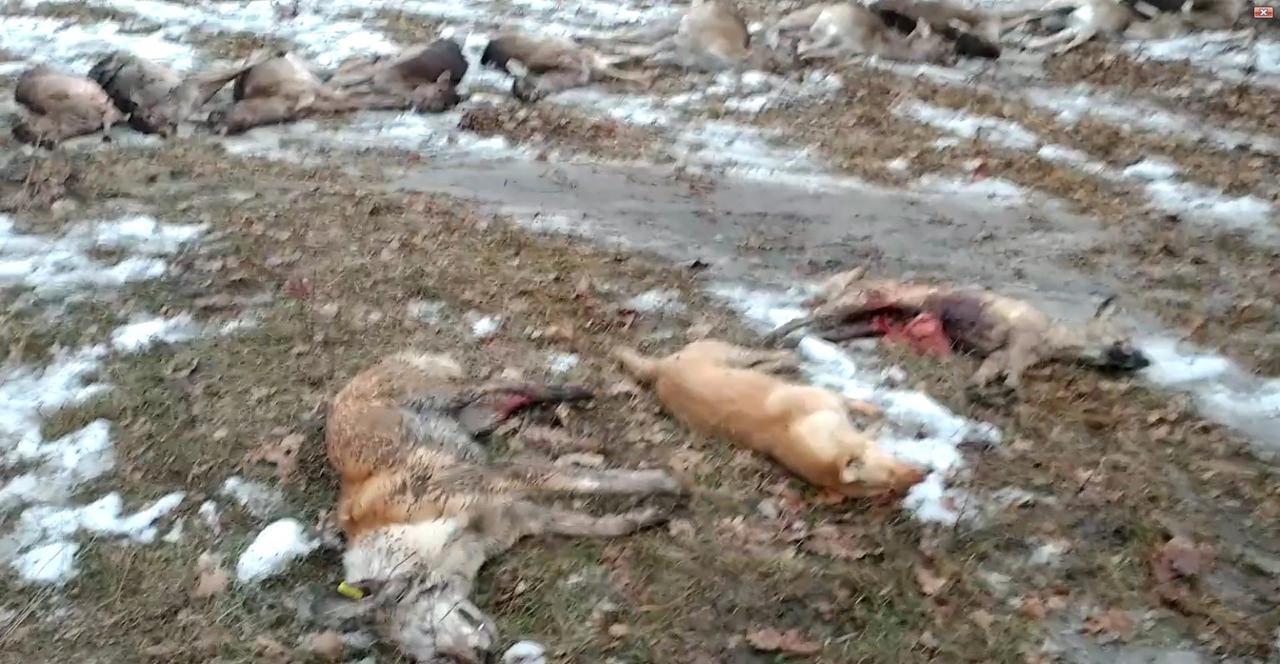 – Результат роботи диких собак. Собаки бірковані, кастровані, випущені в місті. Зараз ми знаходимось далеко в мисливських угіддях. І ось їхній результат. За дві години … підлізли у вольєр, задавили 12 голів лані європейської, – прокоментував автор відео.