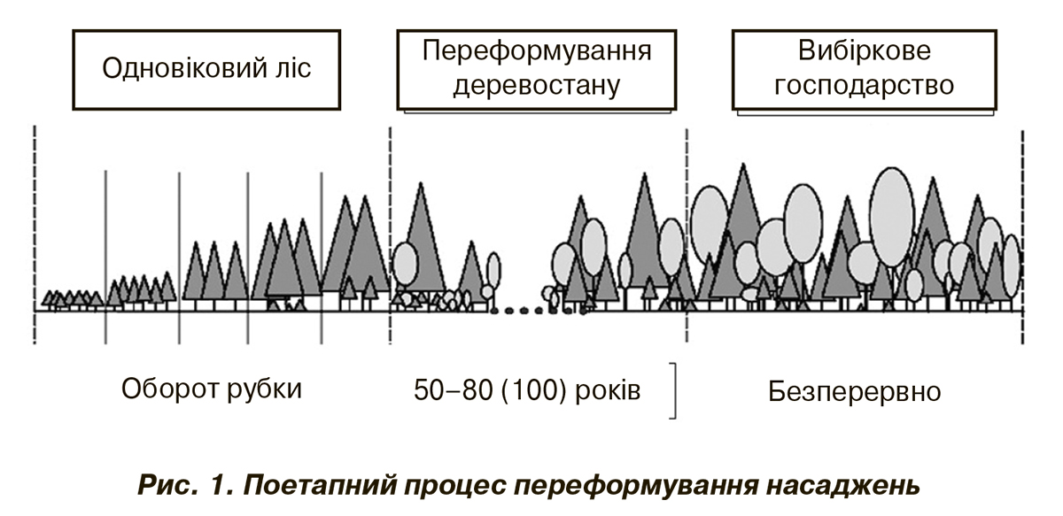 Однією з найважливіших складових цього процесу є поступовий і планомірний перехід від переважаючого застосування суцільнолісосічних рубок до вибіркових методів ведення лісового господарства (рис.1) на основі механізації лісозаготівельних робіт і природозберігаючих технологій.
