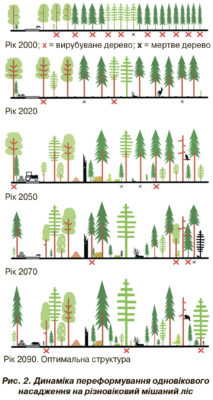 Рубки переформування – складова процесу переформування, зокрема вибіркової системи господарювання (рис. 2). Тому для конкретного лісового масиву передовсім встановлюють критерії його оптимальності з урахуванням типу лісу та функціонального призначення лісів. Основними критеріями оптимальності майбутнього деревостану є бажаний склад і структура насадження, його стійкість і здатність до самовідновлення. Для цього визначають цільові або граничні параметри: склад деревостану; вікову, вертикальну і горизонтальну структури; зімкнутість деревостану; остійність дерев; стійкість насаджень; характер природного поновлення; кількість надійного підросту; проекційне покриття трав’янистих рослин; кількість відпаду.