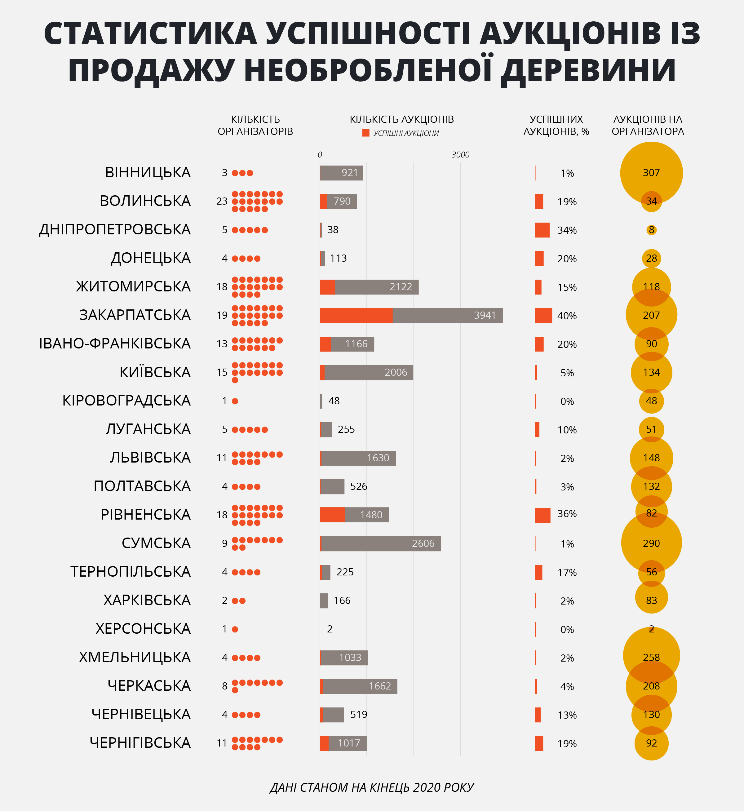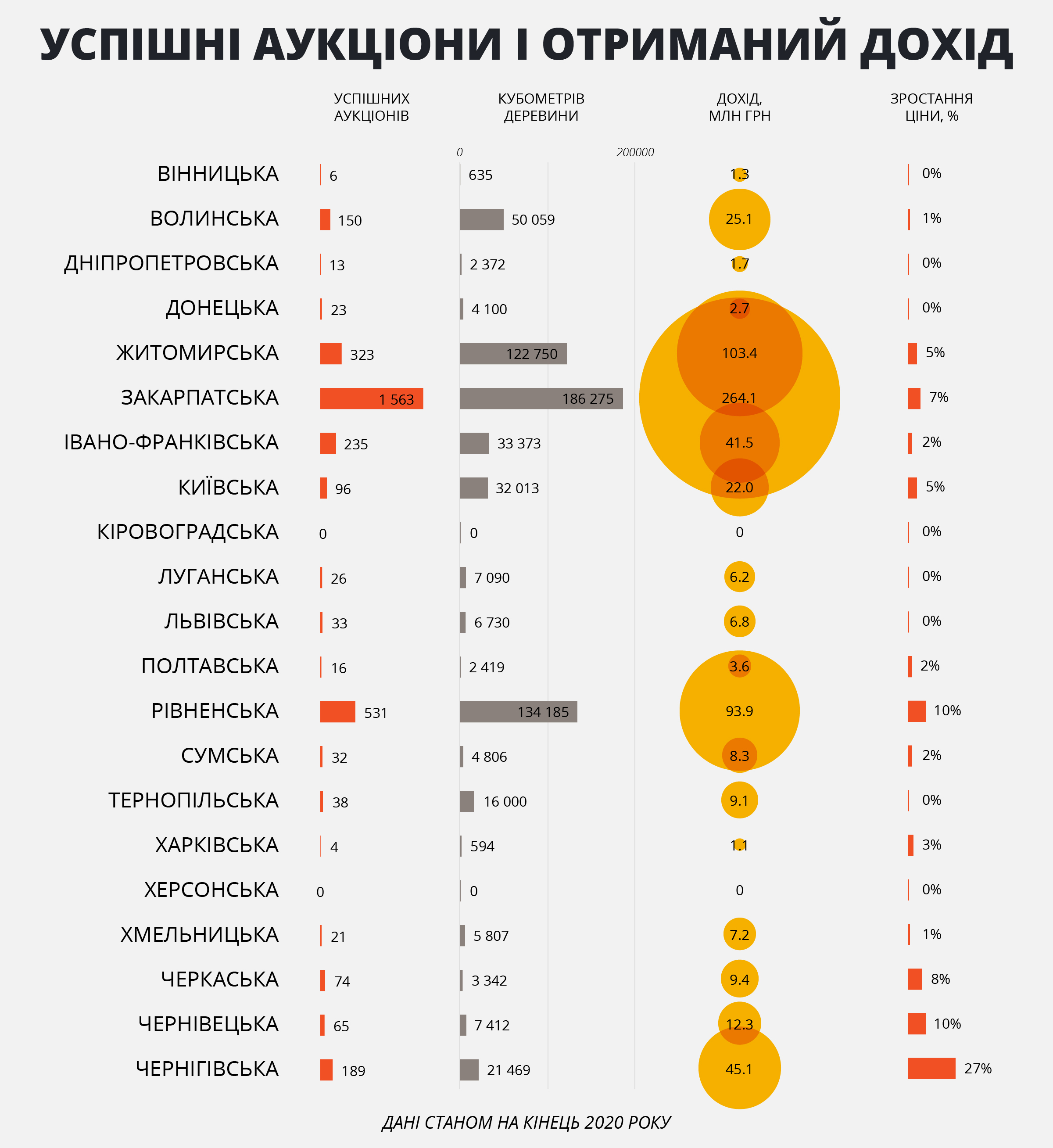 За об’ємами необробленої деревини, яку в рамках експерименту виставляли на аукціонах в 2020 році, лідирують шість областей: Київська, Житомирська, Львівська, Рівненська, Сумська та Закарпатська. Логічно, що саме в цих областях провели і найбільшу кількість аукціонів.