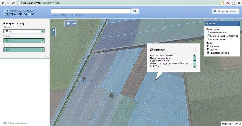 Государственное агентство земельных ресурсов Украины подготовило и открыло для свободного и бесплатного доступа Публичную кадастровую карту, которая должна показывать границы Украины, ее областей, районов и населенных пунктов, кадастровые индексы, границы земельных участков, их кадастровые номера, формы собственности, целевое назначение, площадь, а также карту почв. Пока на карте отражена далеко не вся указанная информация – в частности, показана лишь относительно небольшая часть земельных участков, а по многим из них показываются далеко не полные данные. В качестве основы карты используются ортофотопланы местности.