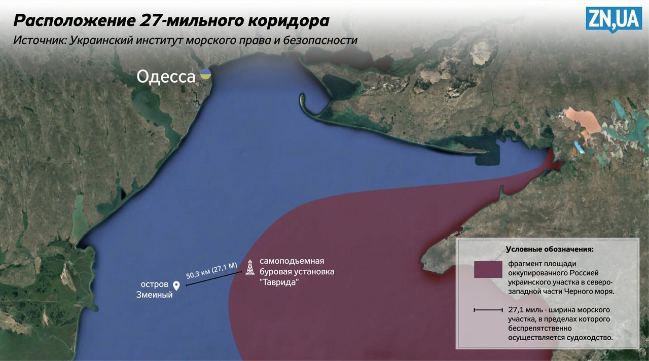 После оккупации Россией Крыма и прилегающих к нему территориальных вод для беспрепятственного гражданского судоходства в украинские порты на черноморском побережье осталась лишь 27-мильная морская полоса между островом Змеиный и самоподъемной буровой установкой «Таврида», захваченной россиянами в 2014 году. Эта полоса контролируется специально развернутыми российскими военными подразделениями с соответствующим вооружением и средствами наблюдения.ZN.UA