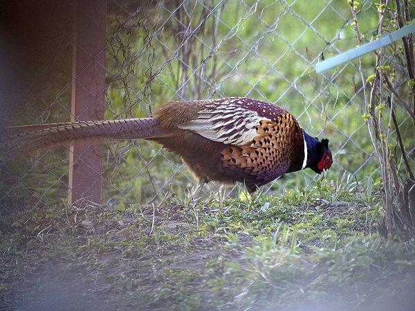 Ну а в нашем дворе завелся красавец- фазан. Отнесли ему под навес перловой крупы. Пугливый жилец понесся во весь дух вдоль забора, пытаясь нырнуть под сетку. Мы ушли, а птица все же вернулась, и долго клевала угощение.