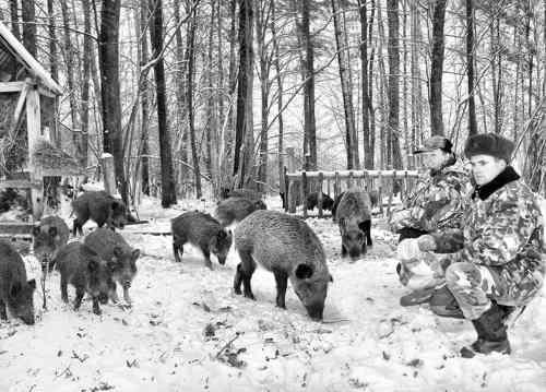 Єгері доставляють корми трактором, кінними саньми та возами. Звірі здалеку чують наближення фури з наїдками, не видимим серед дерев поступом лап і копитець вони прямують до вже звичних для них «їдалень». До єгеря Сьомаківського лісництва ДП «МГ» «Старовижівське» Анатолія Хомича у звірів виняткова довіра. Воно й не дивно: цей чоловік перейнятий піклуванням і любов’ю до лісу, до братів наших менших. Він достеменно знає всі особливості та потреби лісового господарства на своєму обході. На моїх очах на одному з годувальних майданчиків молода самка дикого кабана мало не з рук хапала в нього зерно кукурудзи. Вочевидь, тварини добре «розбираються», хто перед ними — друг чи ворог. Анатолій 15 років тому замінив на посаді батька Григорія Макаровича, котрий свого часу самовіддано боронив звірину від лісопорушників і, зрештою, загинув від кулі злісного браконьєра. Тепер ось уже підріс його внук — шестикласник, названий на честь славного дідуся Гришею, який також нестримно душею і серцем тягнеться до зеленого друга родини — лісу, є татусевим «хвостиком».