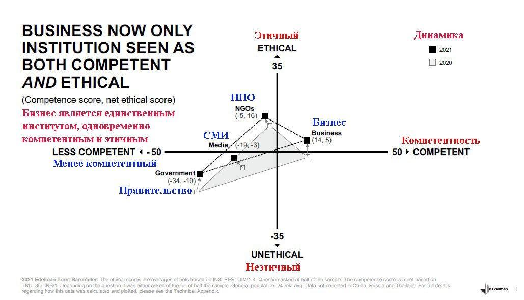 Исследование «Барометр доверия-2021» (Edelman Trust Barometer) к четырем основным общественным институтам – власти, бизнесу, СМИ и неправительственным организациям, которое регулярно проводит консалтинговое агентство Edelman на основе опроса 33 000 респондентов в 27 странах по двум основным показателям – компетентности и этичности (делать правильные вещи и стремиться к позитивному воздействию на общество) показало: Бизнес является единственным институтом, одновременно компетентным и этичным (смотри инфографику). То есть власти не мешало бы не только выслушивать бизнес, но и руководствоваться его предложениями в своей практике. Это позволит правительству только улучшить свою динамику по указанным показателям.