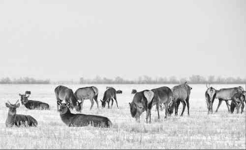 Над білим безгомінням більшає світла. То пробуджене передчуттям весни сонце, розсунувши густу запону хмар, і собі вирішило помилуватися степом, яких мало зосталося на Землі, подивитись на граціозні перебіжки благородних оленів, «танець» на льоду самця лані європейської…