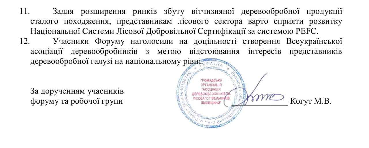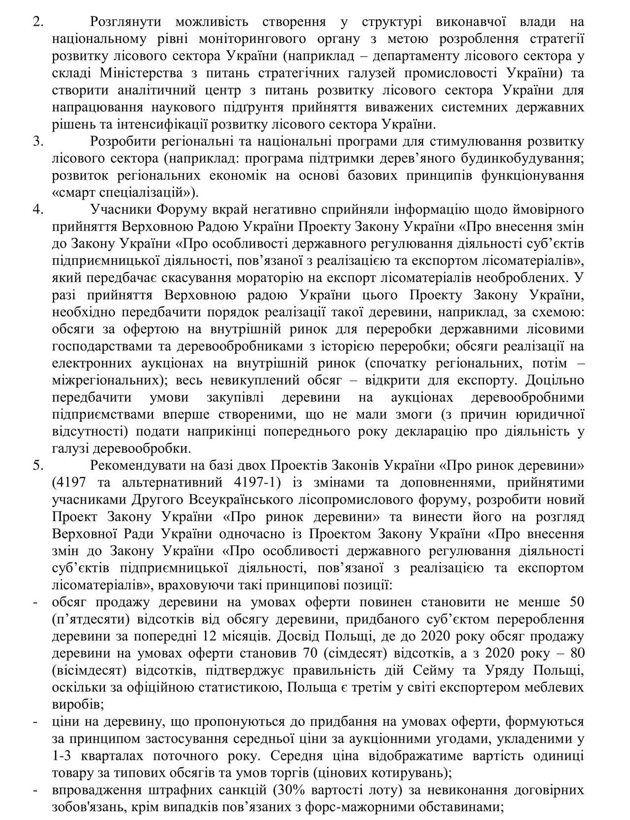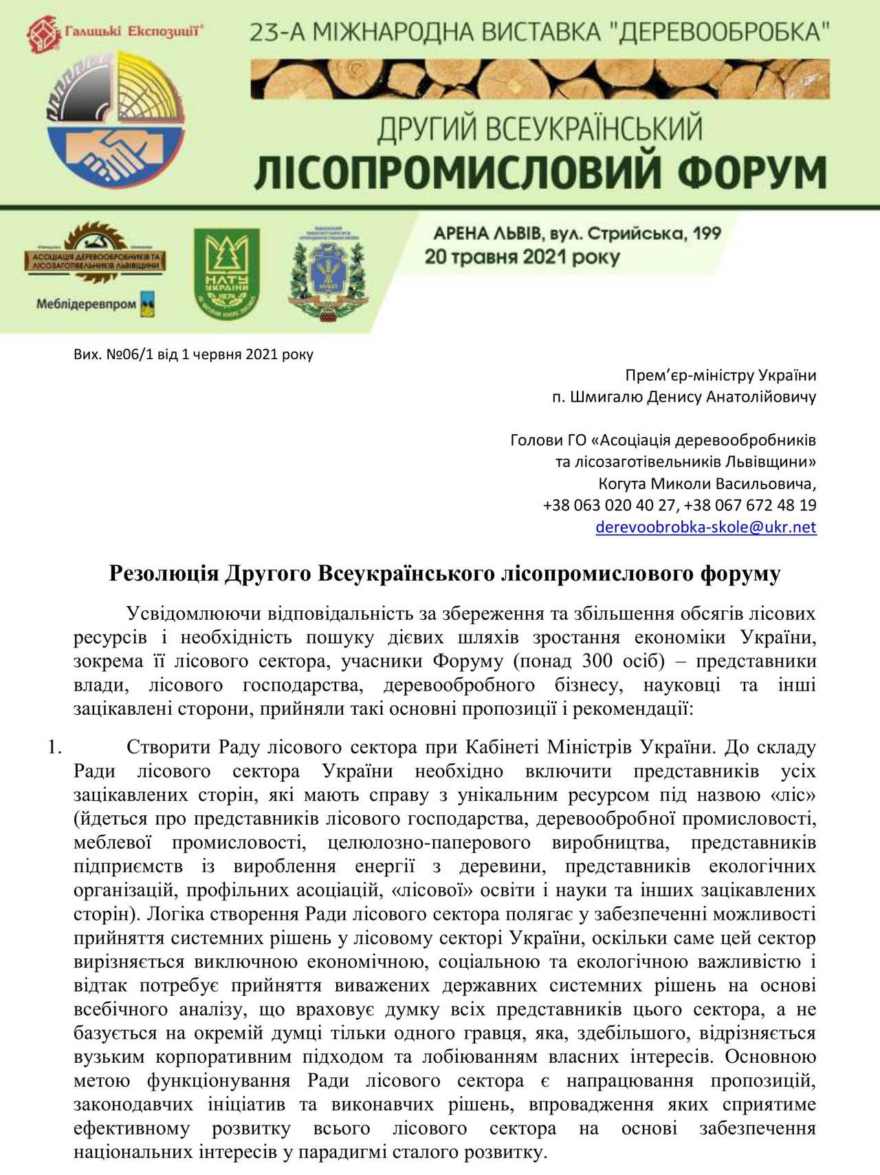 Прошу до Вашої уваги резолюцію Другого Всеукраїнського лісопромислового форуму, яка увібрала в себе пропозиції доповідачів та слушні зауваження присутніх і запрошених форуму.