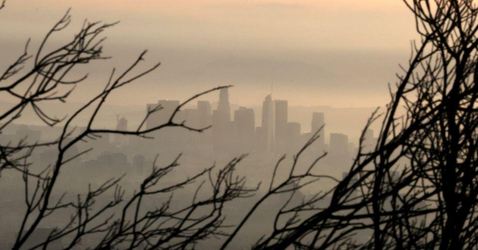 На фото: Центр Лос-Анджелеса виден за деревом, сожженным лесным пожаром. Ожидаются ливневые дожди. Пандемия (COVID-19) продолжается…Лос-Анджелес, Калифорния, США, 28 января 2021 года. REUTERS / Lucy Nicholson