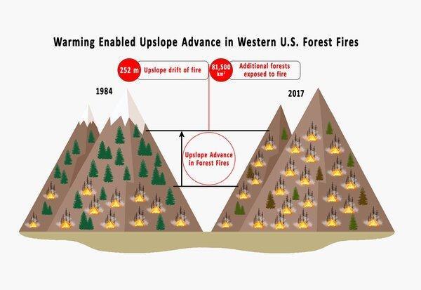 В исследовании, опубликованном в Proceedings of the National Academy of Sciences , исследователи проанализировали записи о пожарах площадью более 405 гектаров в горных районах континентальной западной части США в период с 1984 по 2017 год. Их результаты показывают, что потепление климата уменьшило «барьер воспламеняемости» в высокогорье, представляющий собой точку (высоту над уровнем моря), в которой леса исторически были слишком влажными для регулярного горения из-за длительного присутствия снега. Исследователи обнаружили, что за эти три десятилетия в западных горах пожары поднялись на 252 метра.