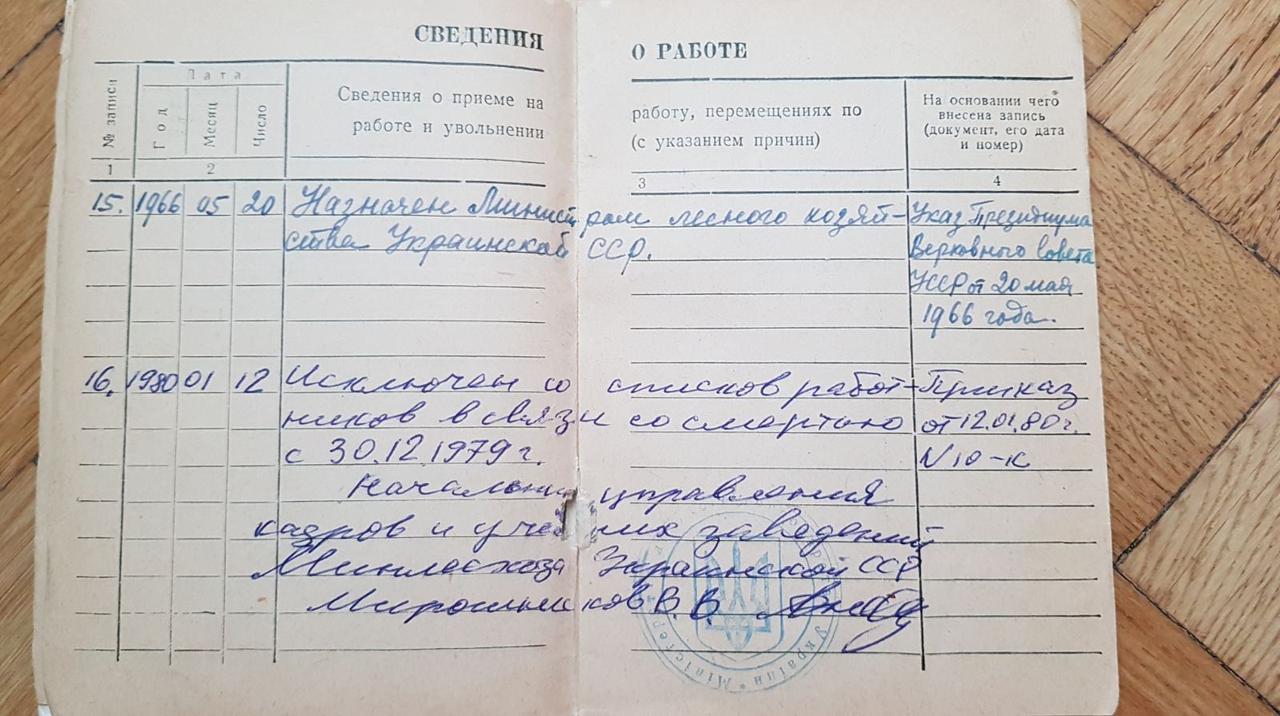 Однако сегодня не об этом. Сегодня вспомним о БОРИСЕ НИКОЛАЕВИЧЕ – ЧЕЛОВЕКЕ И ЛЕСОВОДЕ, который создал лесное хозяйство УССР, считавшееся одним из лучших на просторах Советского Союза. Посмотрите на последнюю страницу трудовой книжки этого человека и всё поймете.